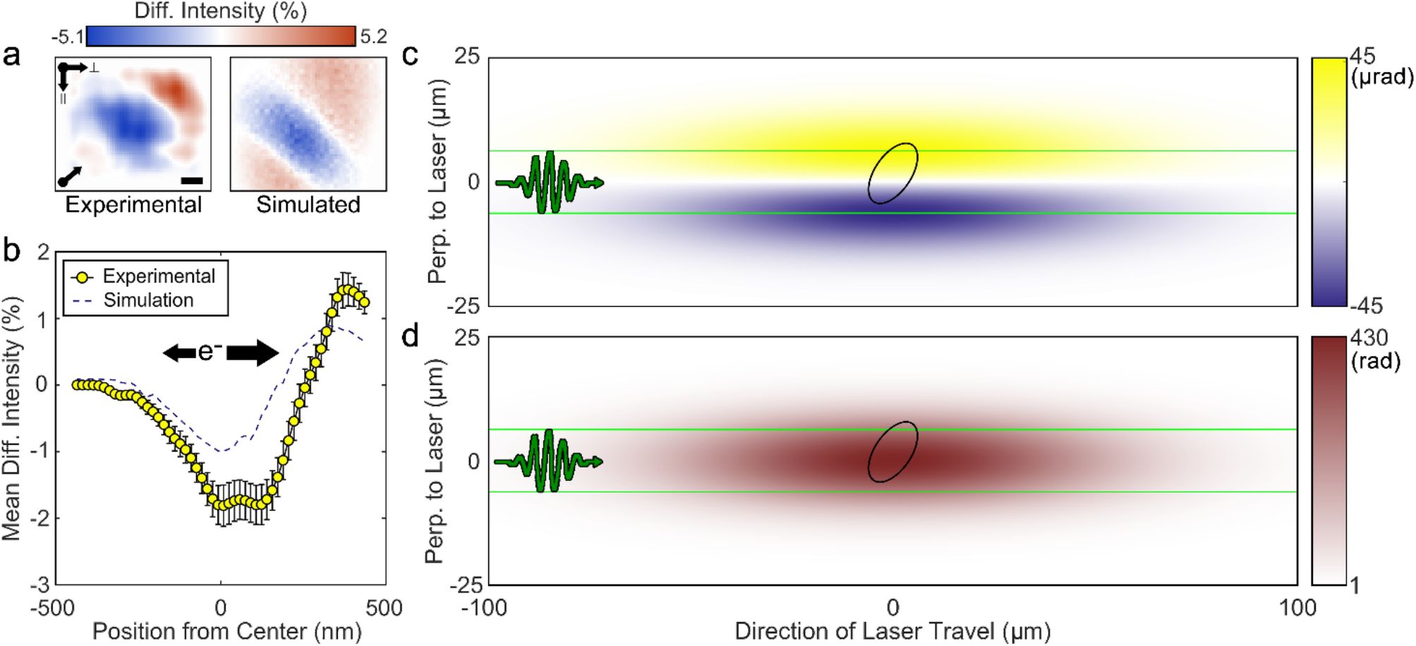 a, Difference images were generated by subtracting the negative-time reference image, acquired 21-67 ps before the photons arrive, from the time-zero image, when the photon pulses overlaps the electron packets. After noise filtering, these experimental difference images (b, top) are compared with simulated counterparts (b, bottom). The colorbar indicates the difference intensity in percentage of peak image counts. Axes are provided to indicate directions parallel and perpendicular to the laser Poynting vector. A third arrow is used to show the near-diagonal direction of laser lensing due to the ponderomotive effect. Scale bar, 100 nm. c, A line profile of the difference intensity along the axis of pulsed-laser lensing due to the ponderomotive effect. The direction along which electrons are preferentially pushed is indicated by the larger black arrow. Experimental data is shown as filled yellow circles (±S.E.M.) with simulated data shown as a dashed line. c, Momentum shift (µrad) produced by the ponderomotive effect in the axis orthogonal to both beams. A 500-fs laser pulse (green wave packet, propagating left-to-right) intersects an electron packet that moves into the page (black outline). The continuous green lines mark the 12.5 µm laser-beam diameter, while the black ellipse (major axis ∼15 µm) shows the simulated electron-beam profile calculated from the experimental parameters in Supplementary Table S1. d, The ponderomotive effect generated by the pulsed laser (green wave packet propagating left-to-right; 12.5 µm beam bounded by solid green lines) imparts an equivalent phase shift of roughly 430 radians to the electron packets traveling into the page (black outline).